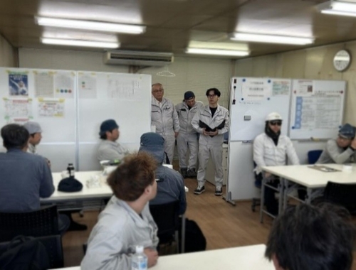 協力会社さんとの朝礼では、本日の作業内容や注意点を共有し、現場へ向かう準備を整えます。