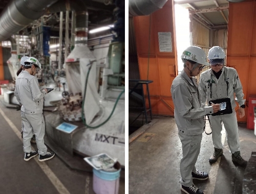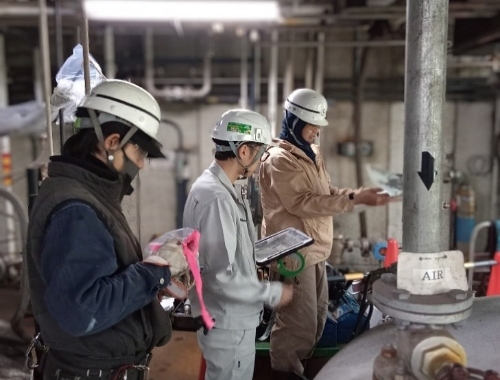 事前に確認した設備の状況を職人さんと照らし合わせながら、当日の作業手順や危険箇所を丁寧に説明しています。現場ごとに状況が異なるため、こうした細かな確認が安全につながります。