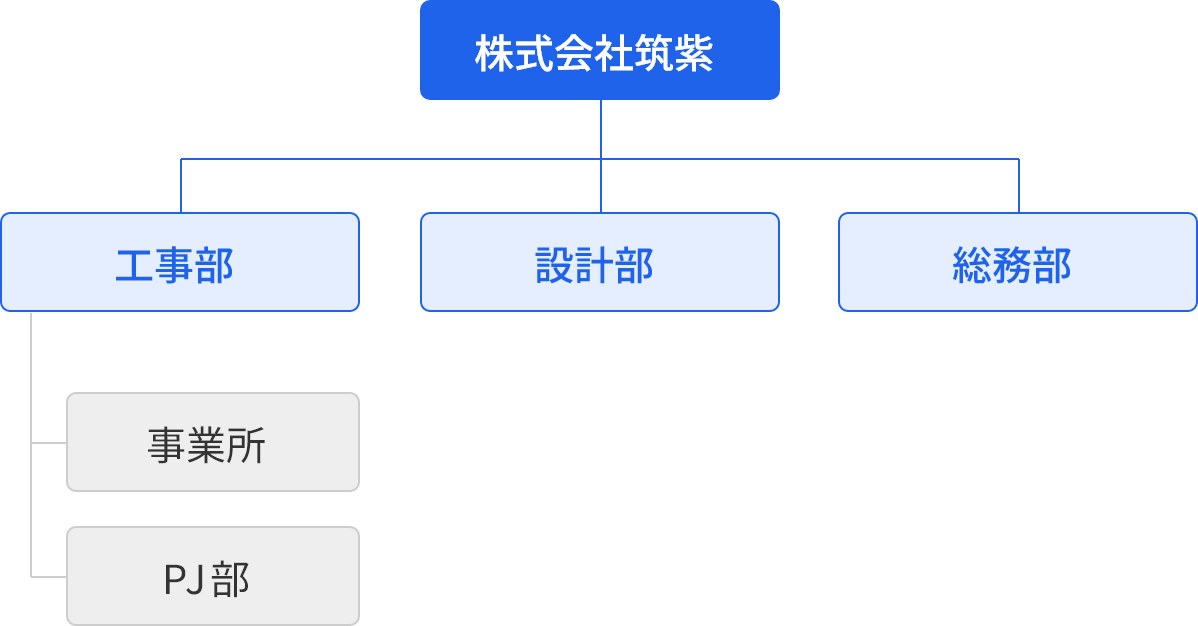 当社には、工事部・建設部・総務部の3つの部門があり、工事部は事業所・PJ部という専門分野に分かれます。